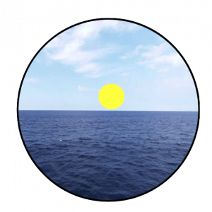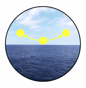 Der Kimmabstand ist die senkrechte Verbindungslinie und damit die kürzeste Verbindung zwischen Sonnenmitte und Kimm. Da es aber unmöglich ist, den Sextanten immer genau senkrecht zu halten, muss ein Trick angewendet werden, der darin besteht, ihn leicht um seine Horizontalachse zu schwenken. Dabei pendelt das Bild der Sonne im Teleskop, wie es im Bild 3.5 zu sehen ist. Erst wenn die Sonne in der tiefsten Pendelposition die Kimm gerade noch berührt, stimmt die eingestellte Höhe. Man sagt dazu auch, dass die Sonne die Kimm küsst. Wenn die Sonne am Vormittag noch steigt, kann mit der Trommel eine Höhe eingestellt werden, bei der der Unterrand der Sonnenscheibe noch ein wenig ins Wasser eintaucht. Nun braucht man nur noch zu pendeln. Dabei steigt die Sonne und taucht in Sekundenschnelle aus dem Wasser heraus. Sobald die Sonnenscheibe die Kimm gerade noch schrammt, wird „Stopp“ gerufen, damit ein Helfer eine Stoppuhr anhalten kann, die zu einer vollen Minute einer Uhr mit der Universalzeit UTC gestartet wurde. Die sekundengenaue Messzeit kann daraufhin problemlos bestimmt werden.