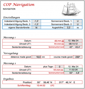 Im folgenden Beispiel wird eine Berechnungstabelle gezeigt, wie sie in einer Tabellenkalkulation, z. B. Excel oder Numbers, verwendet werden kann und eine komplette Positionsberechnung nach zwei Sonnenbeobachtungen mit Versegelung zeigt. Grundlage der Berechnungen sind die in den Abschnitten 4.3 und 4.4 gemachten Ausführungen. Während einer Fahrt am 12. Mai 2024 in der Ostsee wurden folgende Beobachtungen durchgeführt: