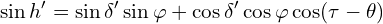 (4.18) ![Rendered by QuickLaTeX.com \[\tau=\arccos\frac{\sin hs-\sin (\varphi_M+\Delta\varphi)\;\sin\delta'}{\cos (\varphi_M+\Delta\varphi)\;\cos\delta'},\]](https://astro-navigation.com/wp-content/ql-cache/quicklatex.com-3e7eafe4030ffb586ff64b1242ae686a_l3.png)