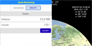Nach Eingabe der geschätzten Versegelungsdaten von Distance = 12,5 NM und Course = 170° müssen diese mit ACCEPT bestätigt werden. Der daraufhin berechnete Standort wird auf dem Display links unten als Last position angezeigt. Weil nachfolgende zweite Beobachtungen noch den ganzen Tag hindurch möglich sind, werden diese immer als Last position ausgegeben. Dabei muss die Versegelung immer ab der ersten Beobachtung eingegeben werden. In der Pro-Version wird außerdem noch eine DR Position angegeben, die sich aus der letzten Position und den Daten des Dead Reckoning Moduls zusammensetzt.