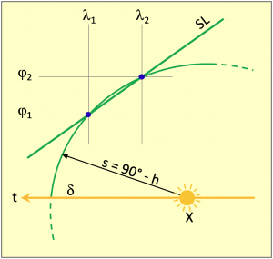 Die Schnittpunkte dieser Breiten mit den berechneten Längen liefern zwei Punkte auf einer Karte und wenn diese miteinander verbunden werden, so hatte man eine Linie, auf der sich das Schiff irgendwo befinden musste, eine Standlinie, die im Bild mit SL gekennzeichnet ist.